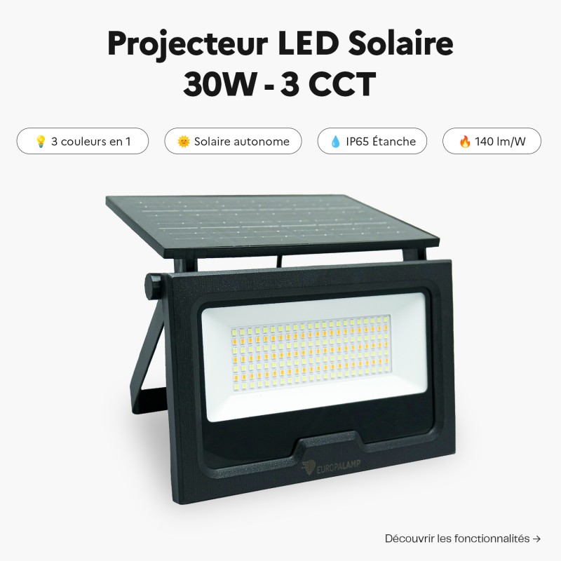 Projecteur LED Solaire 30W – 3 CCT (3000K / 4000K / 6000K) | 4200 Lumens | IP65 Étanche