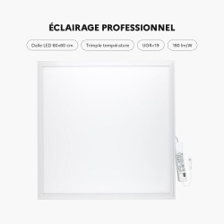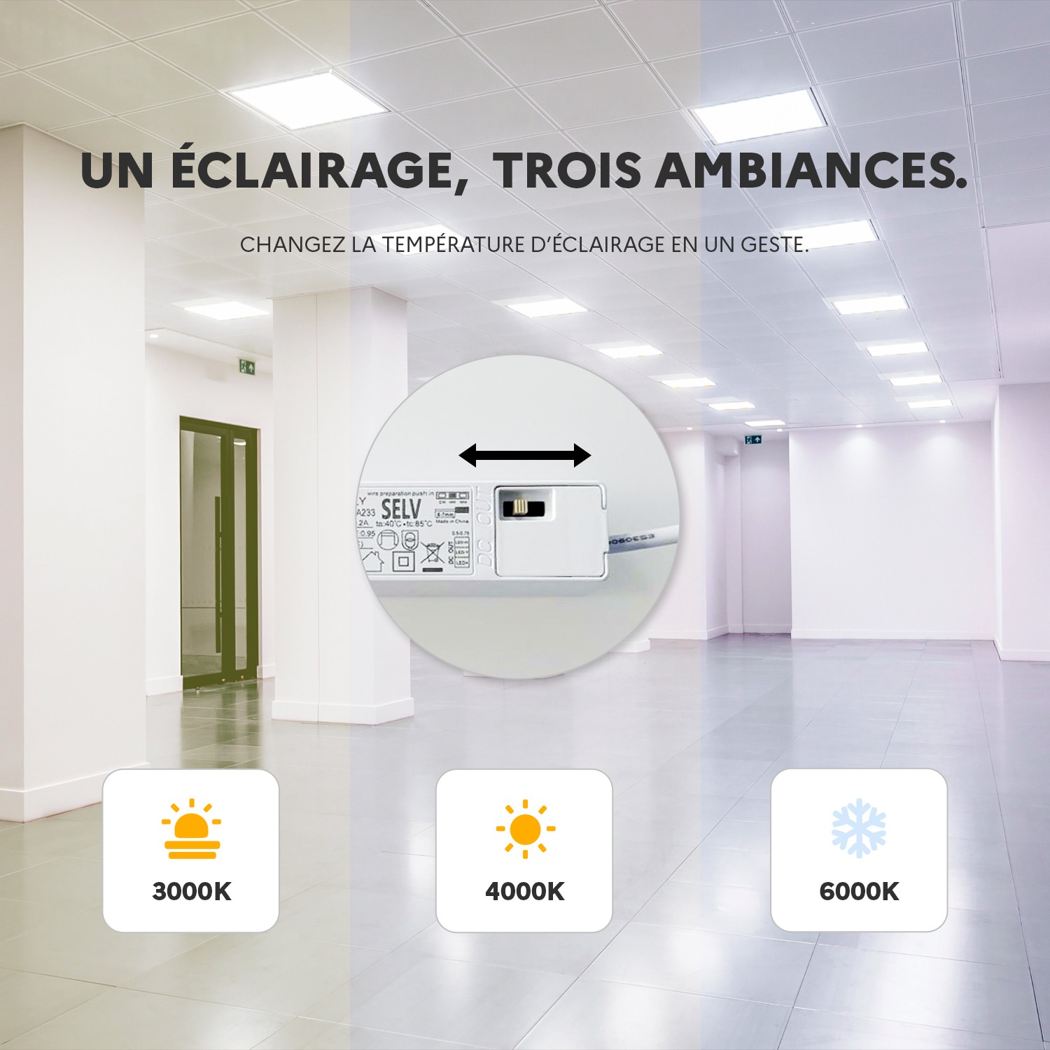 Cette dalle LED 60x60 cm s’intègre directement dans un faux plafond standard. Grâce à son driver EMC fiable, elle délivre 3600 lumens sans scintillement et permet de choisir entre 3 températures de couleur via un simple sélecteur :