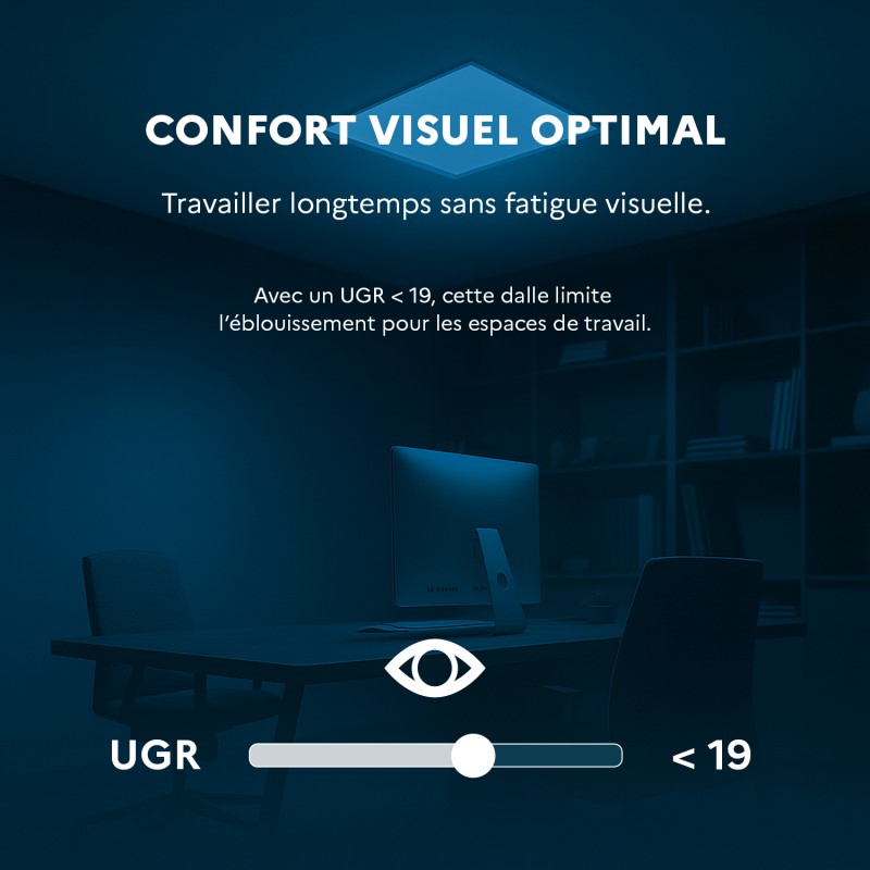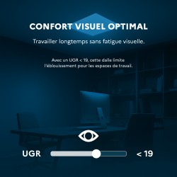 Elle diffuse une lumière homogène avec un angle de 120°, sans zone d’ombre ni fatigue visuelle. Son UGR < 19 la rend idéale pour tous les environnements professionnels.