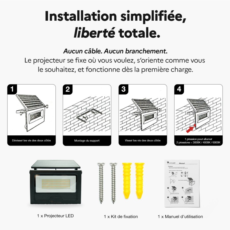 Installation simple, sans câble ni branchement : Se fixe facilement sur mur ou support. Kit de fixation inclus + manuel en français.