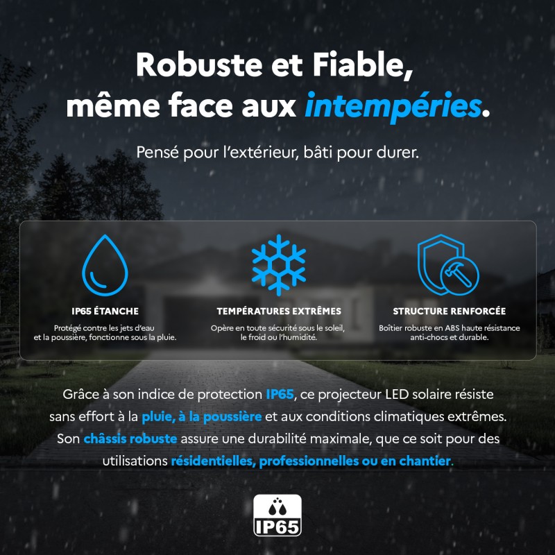 Conçu pour l’extérieur, son boîtier en ABS haute résistance garantit une excellente durabilité. Grâce à la certification IP65, il résiste à la pluie, à la poussière et aux températures extrêmes.