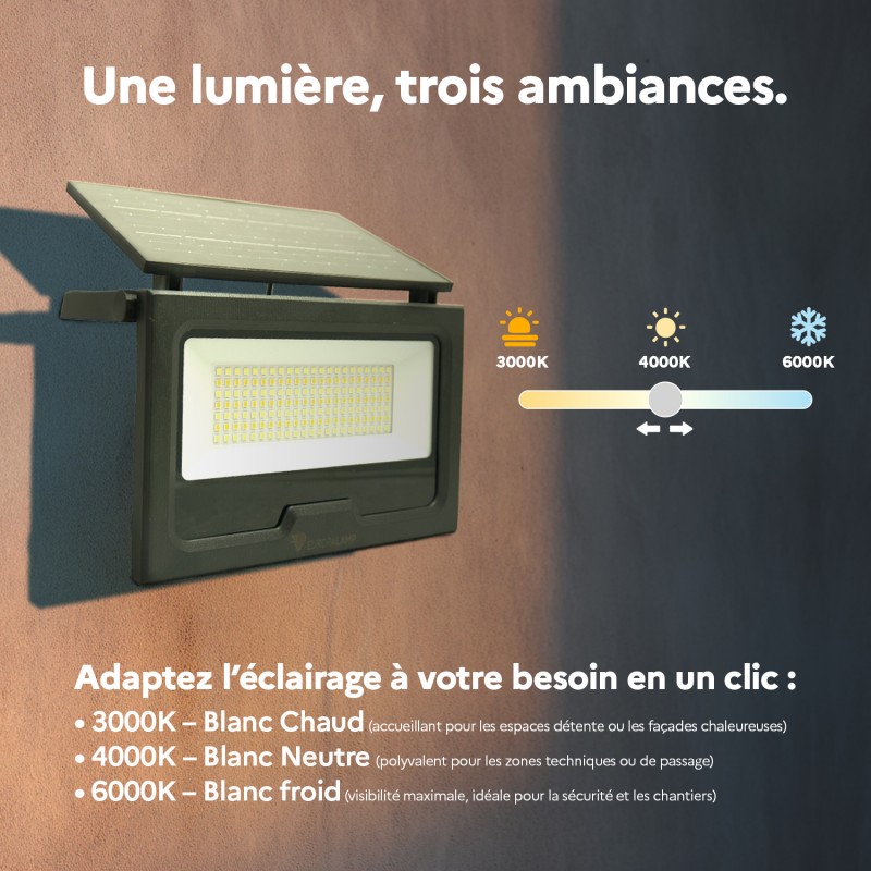 3 températures de couleur en 1 seul projecteur : Passez de 3000K (blanc chaud) à 4000K (neutre) ou 6000K (froid) en un clic selon vos besoins : ambiance détente, zone technique ou sécurité.