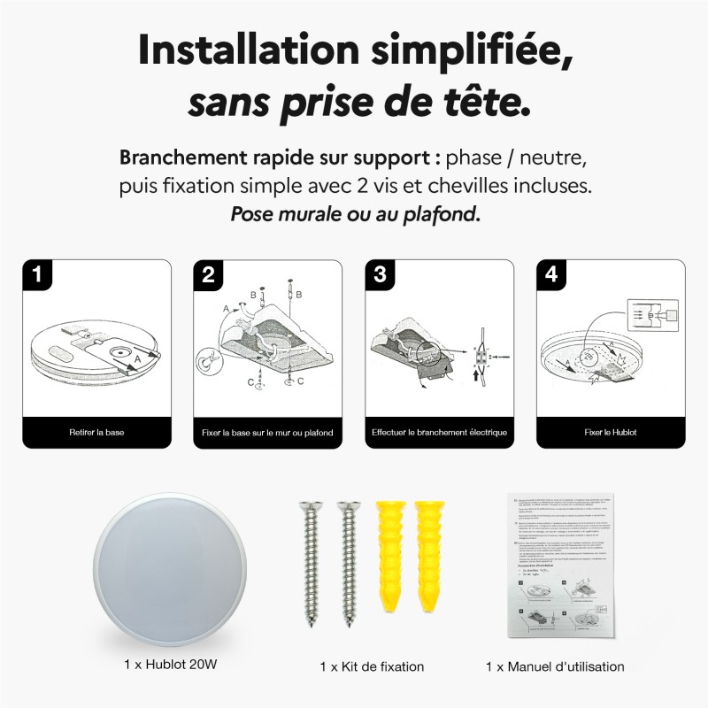 Installation rapide & sans prise de tête : Fixation murale ou plafond en 4 étapes simples – vis et chevilles incluses.