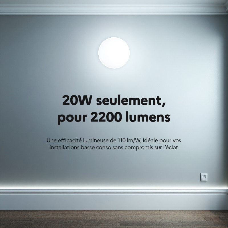 Éclairage performant & économique – 20W pour 2200 lumens : Une efficacité lumineuse de 110 lm/W, idéale pour vos espaces résidentiels ou professionnels.