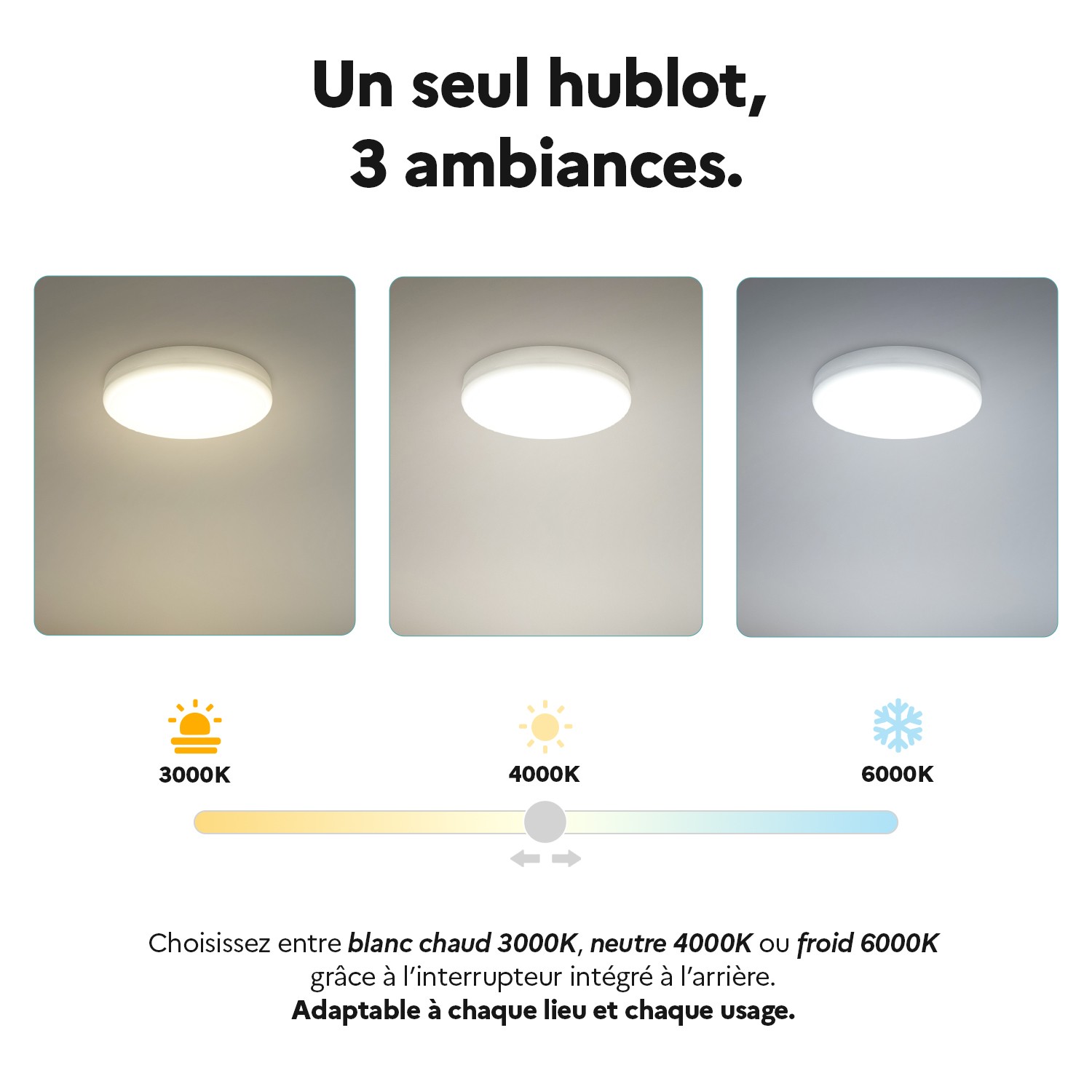 3 couleurs en 1 – 3000K / 4000K / 6000K : Choisissez entre blanc chaud, neutre ou froid grâce au commutateur 3CCT intégré à l’arrière du hublot.