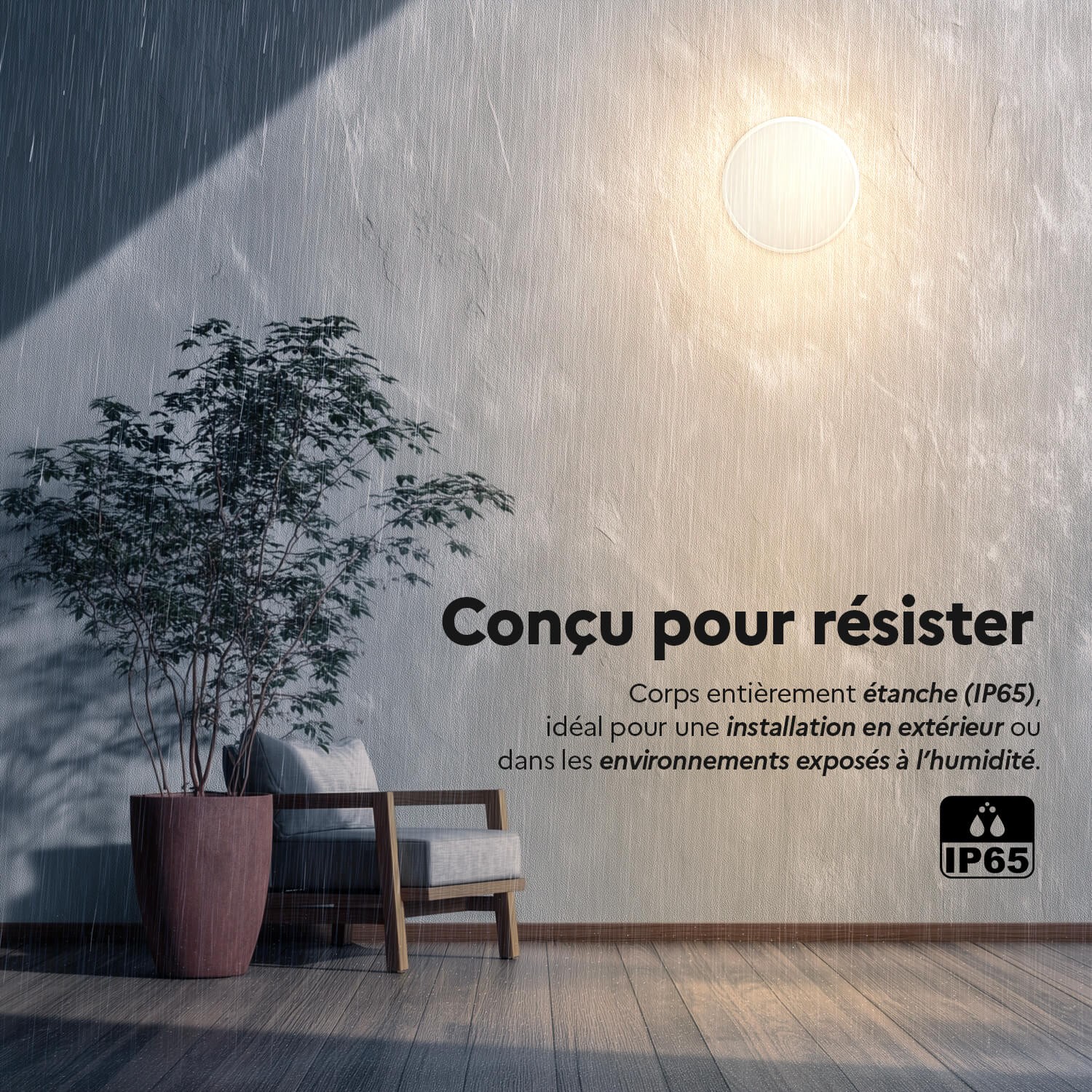 Son boîtier robuste et totalement étanche protège l’éclairage de la pluie, de la poussière et de l’humidité. Parfait pour les environnements exposés comme les terrasses couvertes, les halls d’entrée ou les pièces d’eau.