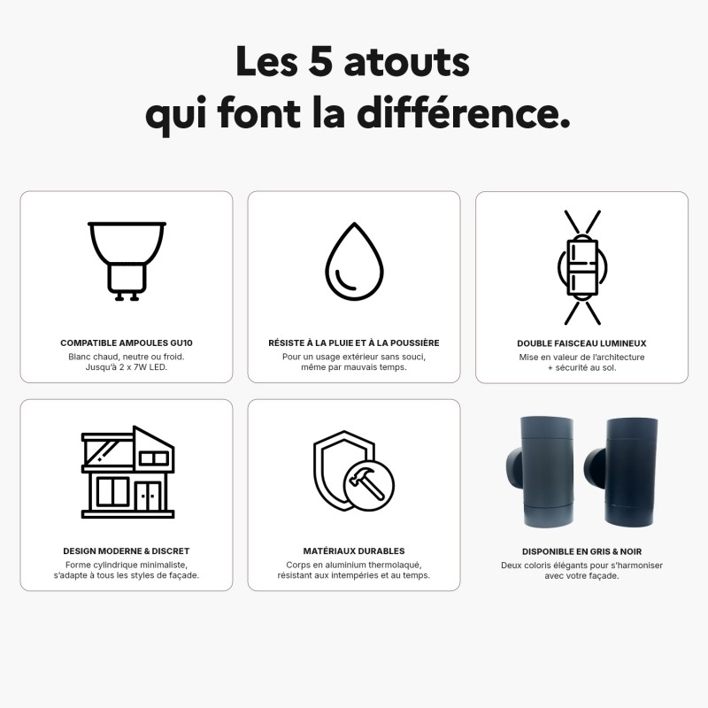 Éclairage double faisceau haut/bas : Valorisez vos façades et sécurisez vos allées grâce à un faisceau lumineux orienté vers le haut et vers le bas.